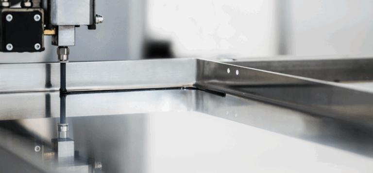 El robot cartesiano está compuesto por tres ejes de movimiento. Es suficiente apoyar el panel en la superficie específica, dirigiéndolo hacia el «punto 0», y la máquina leerá automáticamente su medida y procederá, después de recibir una orden del operador, con la colada de la junta.